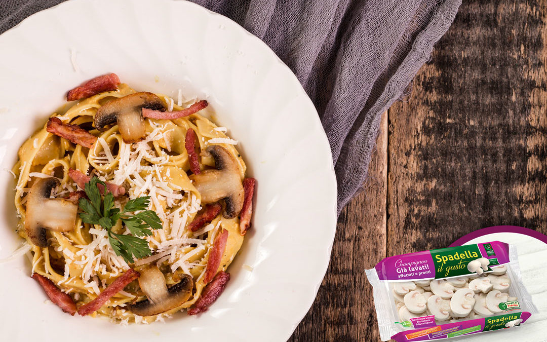 Mettete i Funghi Champignon Spadella il Gusto in una grossa padella antiaderente con coperchio, e lasciateli a fiamma bassa per pochi minuti. Dopo di che trasferiteli in un piatto. Nella stessa padella fate appassire l’aglio in olio extra vergine d’oliva, mescolando di tanto in tanto. Aggiungete il vino, unite la pancetta tagliata a listarelle e aggiustate di sale. Coprite la pentola e lasciate cuocere per circa 5 minuti a fiamma dolce. Nel frattempo mettete a bollire l’acqua per la pasta e snocciolate le olive. Scolate la pasta al dente e aggiungetela al sugo di funghi e pancetta mescolate e decorate con le rondelle di olive verdi e completate il piatto con una spolverata di prezzemolo tritato e di parmigiano grattugiato. Pronti a dare il benvenuto all’estate? Buon appetito!