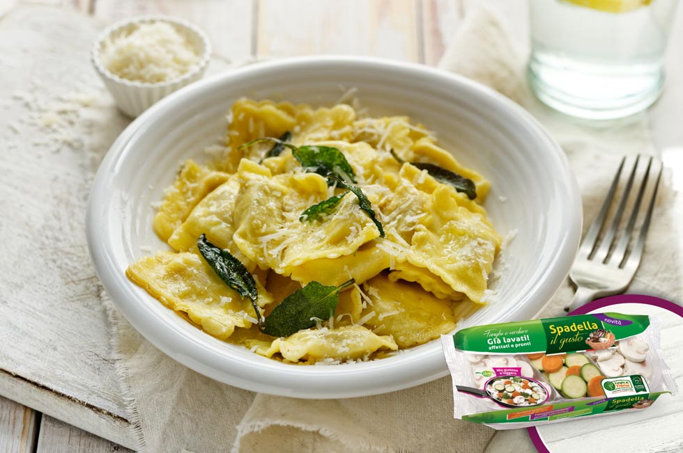 Per prima cosa metti a bollire l’acqua salata per i ravioli. Nel frattempo, in una padella capiente, scalda un filo d’olio, aggiungi i Funghi e verdure Spadella il gusto, qualche foglia di salvia e fai cuocere per qualche minuto.